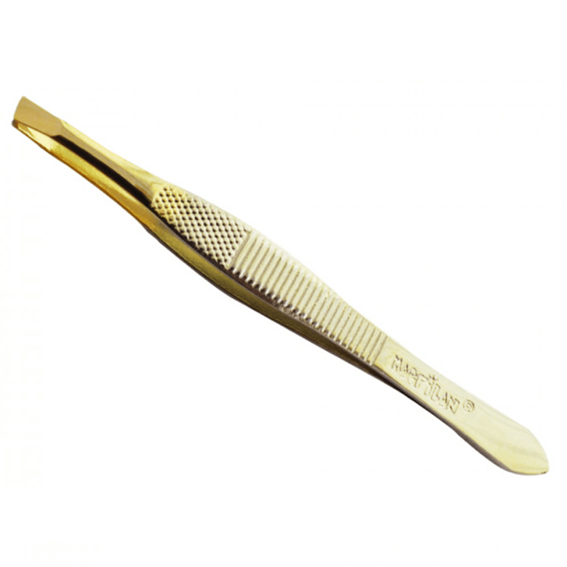 Pinça Macrilan PI-2 especialmente desenvolvida para remoção de pelos da face e corpo. Com acabamento dourado e corte reto para uso pessoal e profissional com praticidade e segurança.