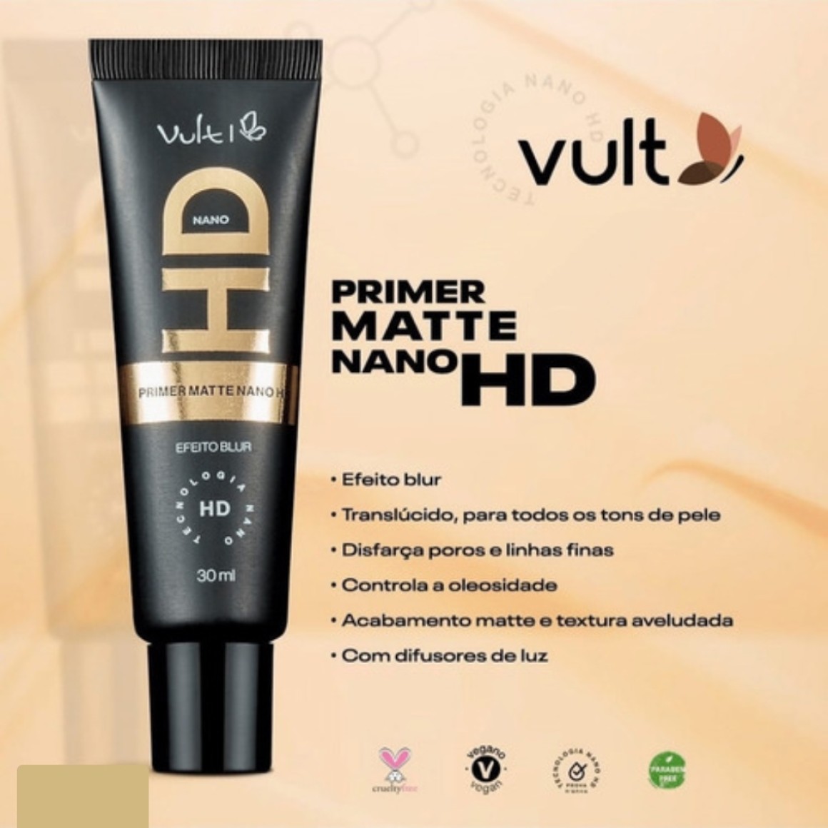 Primer com acabamento matte. Vult Nano HD garante um efeito Blur inteligente e uma pele uniforme. Ideal para prolongar a maquiagem e controlar a oleosidade. O Primer Vult Nano HD confere um acabamento aveludado e matificado. Sua fórmula conta com difusores de luz que disfarçam poros e linhas de expressão.