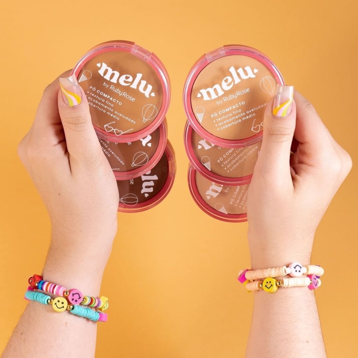 O Pó compacto Melu possui textura fina, acabamento aveludado, cobertura média, você sente que a cor e a textura são reais! O produto é macio, tem aquele toque aveludado e sequinho, ficar levemente matte no rosto, mas sem ressecar a pele. O PÓ COMPACTO MELU com uma paleta diversa e completa, com 6 tons que servem para todos os tipos e tons de pele. Tudo isso sem falar da fórmula vegana e a embalagem moderna que você vai desejar ter na bolsa, sem correr o risco de estragar o produto. É paixão ao primeiro uso!