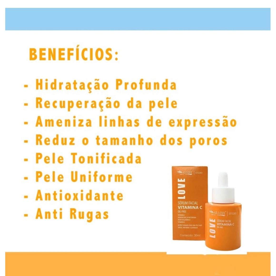 O Sérum Vitamina C 10 em 1 Max Love contém um blend de componentes antioxidantes e hidratantes, que auxiliam na hidratação, maciez e tonificação, proporcionando uma pele com aparência uniforme e fresca.