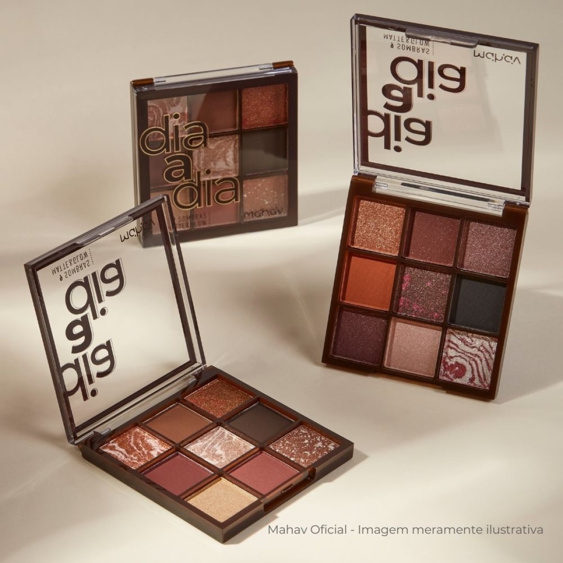 A PALETA DE SOMBRAS 9 CORES DIA A DIA MAHAV traz tons variados e versáteis, a principal característica desta belezinha são os pigmentos utilizados na criação das cores. No mesmo estojo apresentamos os tons matte que são considerados clássicos, os cintilantes super pigmentados e aveludados na versão de cores únicas e os cintilantes com fusão de dois ou mais pigmentos que dão um toque especial e sofisticado à produção. As cores combinam entre si e possibilitam diferentes propostas de make, podem ser aplicadas combinadas ou sozinhas, para o dia e para a noite, para todos os gostos, moods e estilos. É para criar looks lindos em qualquer ocasião!
