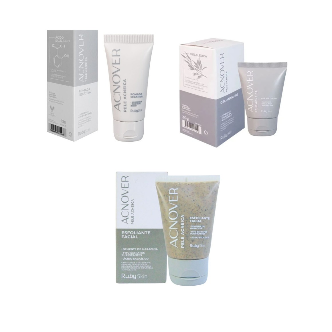 O kit é composto por um esfoliante antiacne, um gel antiacne e uma pomada secativa.
