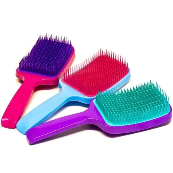 A Escova para cabelos Raquete permite desembaraçar sem puxar ou quebrar os fios. Seu sistema de cerdas em duas alturas ajuda a distribuir óleos naturais da raiz do cabelo por toda a extensão do fio, até as pontas.