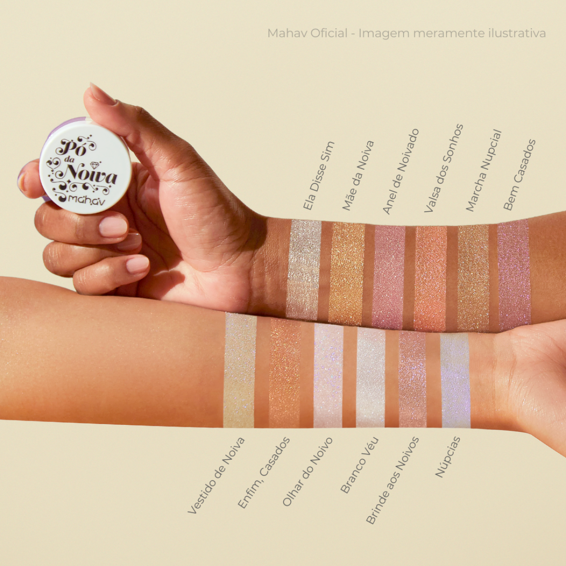 O Pó da Noiva é um pó iluminador composto por um “blend” de pigmentos puros e nobre, perolizados e micronizados, com micropartículas intensas de brilho que aderem com facilidade na pele, oferecendo um lindo fundo de cor #puroluxo, e que podem ser usadas tanto no corpo como no rosto e olhos, possui super pigmentação além de uma iluminação surpreendente!!