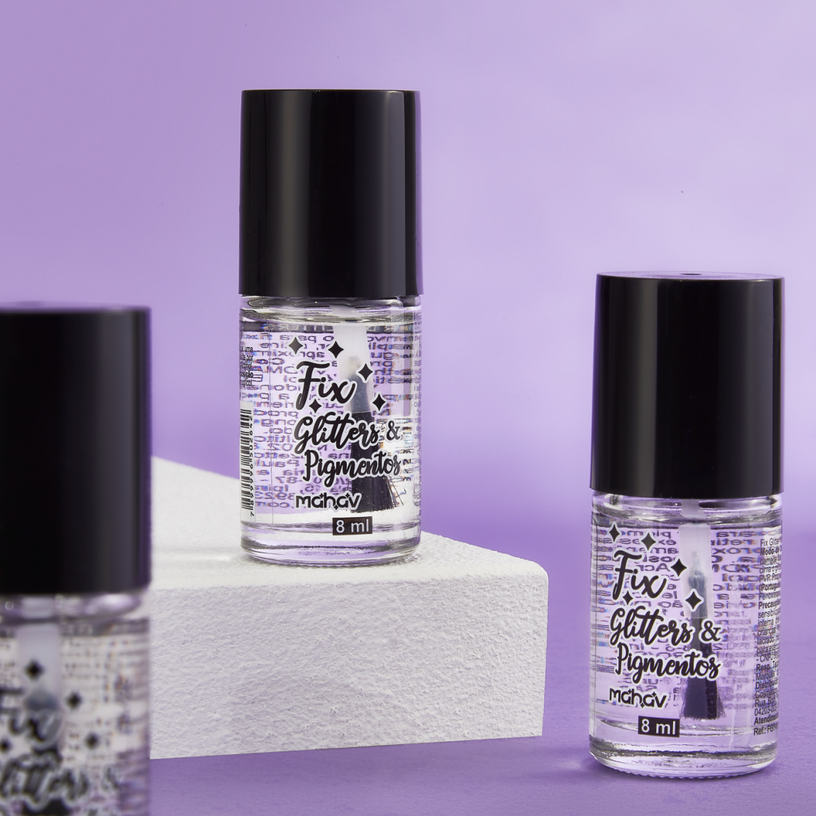 Para aumentar a duração e fixação do seu glitter ou pigmento, a Mahav desenvolveu o Fix Glitter! Produtinho com textura líquida, que, além de ter um ótimo rendimento, permite que você realize misturinhas com glitter para uma aplicação mais precisa.