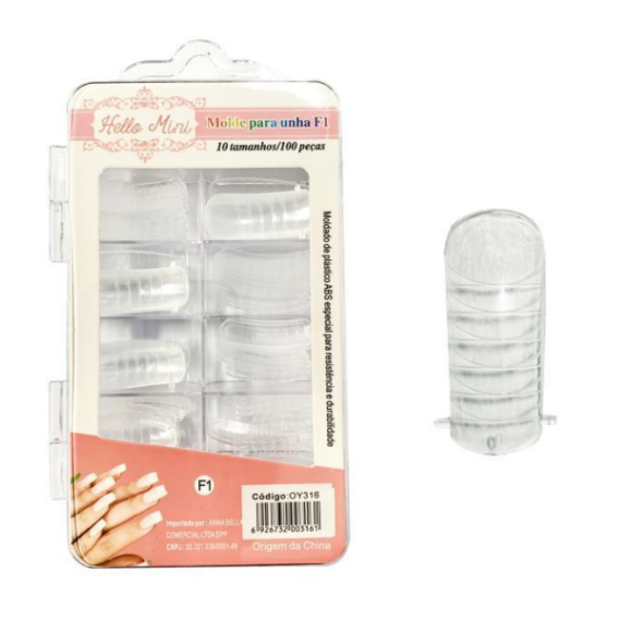 Molde para Unha F1 Hello Mini Contém 01 unidade. Possui 10 tamanhos diferentes, com 100 peças. Moldado de Plástico ABS especial para resistência e durabilidade para moldar unhas de gel, cristal e porcelana, a maneira mais rápida e eficaz de se fazer unhas.