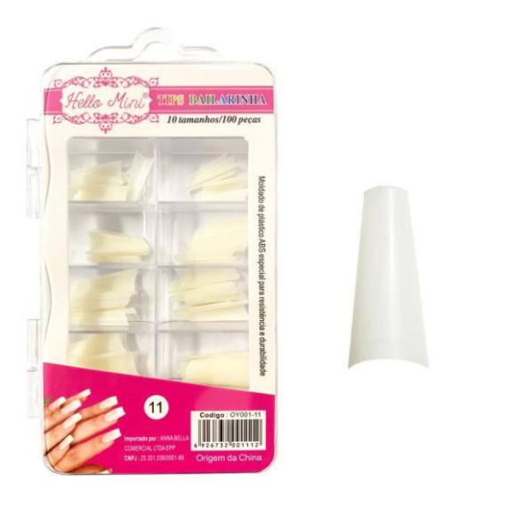Características Técnicas - Modelo: OY001-11 - Tips Bailarinha - Contém: Kit com 100 unhas postiças/10 tamanhos diferentes - Material: Plástico ABS de alta resistência e não trinca - Alonga e dá maior beleza e fino acabamento nas suas unhas - Os tamanhos são separados em compartimentos separados individuais para sua praticidade - Cola não inclusa