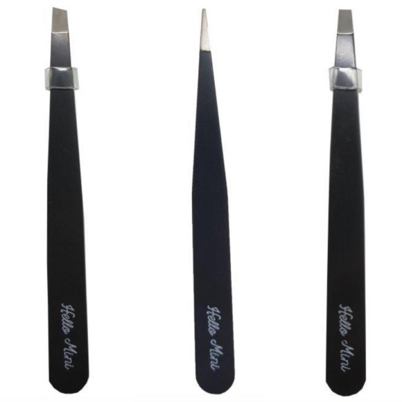 Kit 3 pinças da hello mini vem com 1 pinça ponta fina, 1 ponta reta e 1 ponta chanfrada, perfeita para desenhar e retirar pêlos encravados. Esse modelo também é muito usado para aplicação de cílios fio-a-fio ( alongamento de cílios).