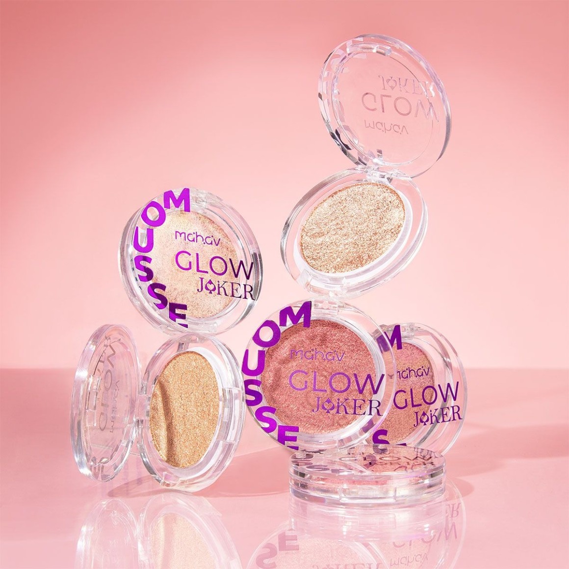 O Iluminador Glow Mousse Joker Mahav traz textura mousse macia e aveludada, que desliza facilmente sobre a pele, oferecendo acabamento cintilante do suave ao ultra brilhante.