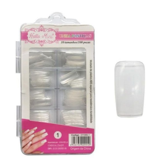 Características Técnicas - Modelo: OY099-1 - Unha Quadrada Alongada Transparente - Contém: Kit com 100 unhas postiças/10 tamanhos diferentes - Material: Plástico ABS de alta resistência e não trinca - Alonga e dá maior beleza e fino acabamento nas suas unhas - Os tamanhos são separados em compartimentos separados individuais para sua praticidade - Cola não inclusa